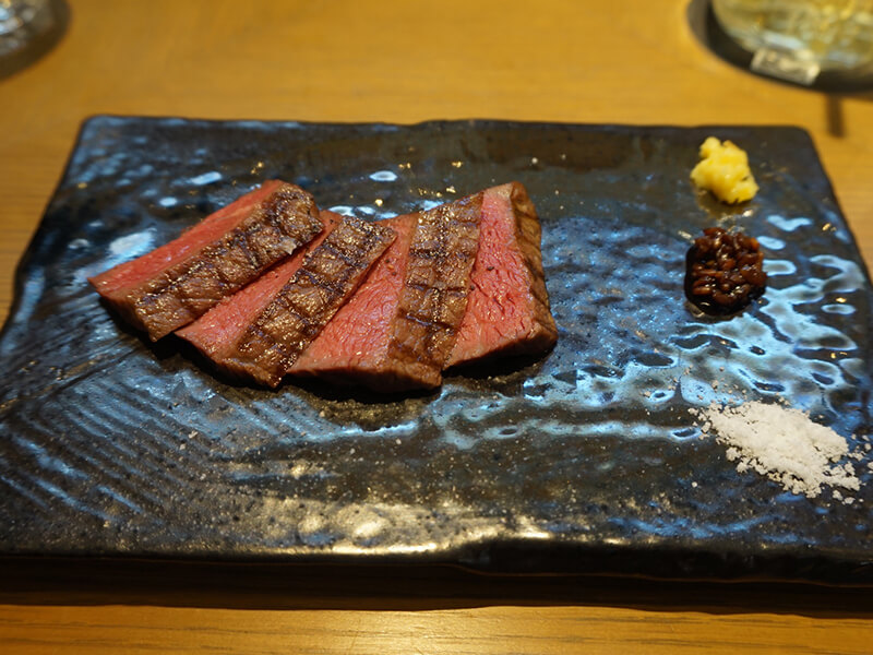 メインのステーキ。塩、醤油麹、柑橘塩の3種の味で楽しめます。