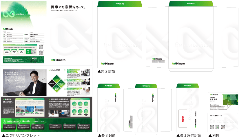 福岡県で足場組立・仮設工事を行っている「株式会社Minato」様のパンフレット・名刺・封筒各種を制作させていただきました。