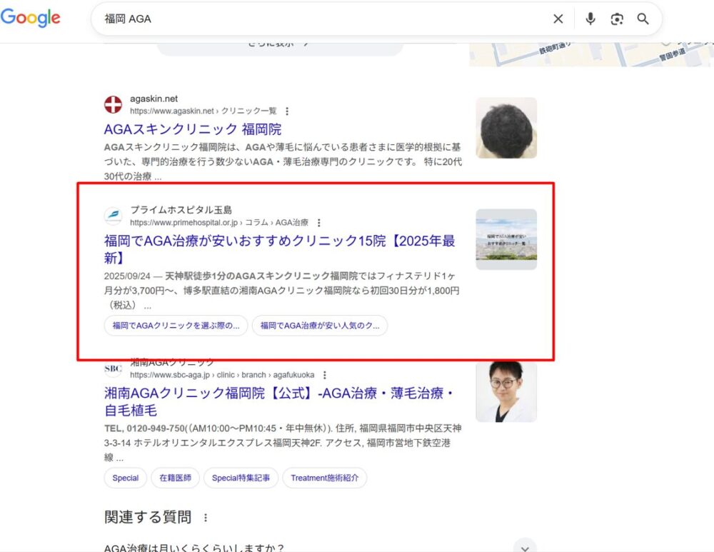 「福岡で『AGA』」と検索したユーザーに対して全く関連性のない岡山の総合病院が一時的に上位表示され、