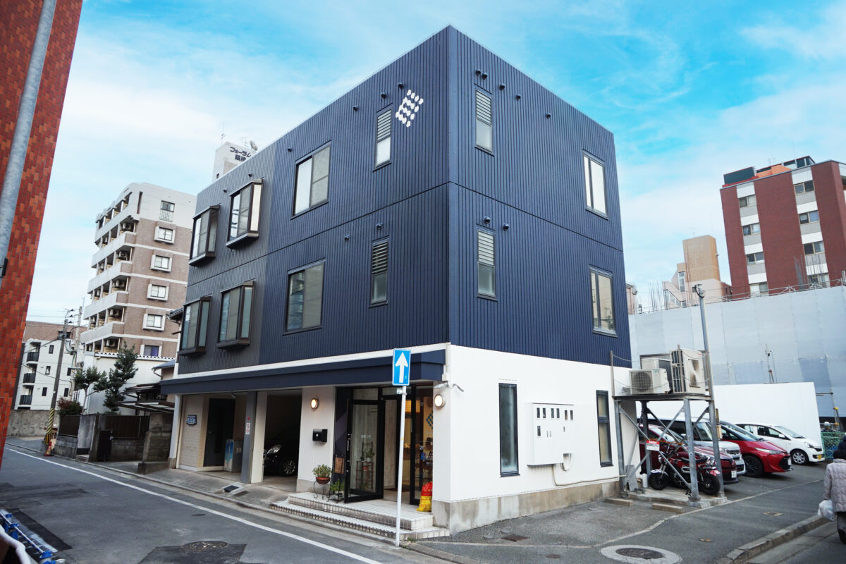 これまでの白い外観から一転、ネイビー/グレーのツートンカラーをベースに3F部分にロゴを配置。